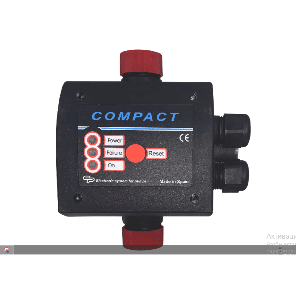 Электронный блок COMPACT предназначен для управления однофазным насосом систем водоснабжения. Прибор управляет работой насоса путем старта по заданному давлению от 1,5 до 3,5 бар (выставляется на корпусе отверткой) и останавливает работу насоса при обнаружении отсутствия протока воды в трубопроводе. Защищает насос по сухому ходу (умная система ART - будет периодически пытаться перезапустить насос при восстановлении водоснабжения). Благодаря встроенному механическому манометру, легко настроит стартовое давление и контролировать его. Встроенная в прибор мембрана предотвратит гидро удар в случае выхода из строя гидроаккумулятора. Кабели подключения к электрической сети и насосу, дают возможность не разбирая прибор быстро и качественно инсталлировать его к насосу. Подходит для поверхностных насосов.